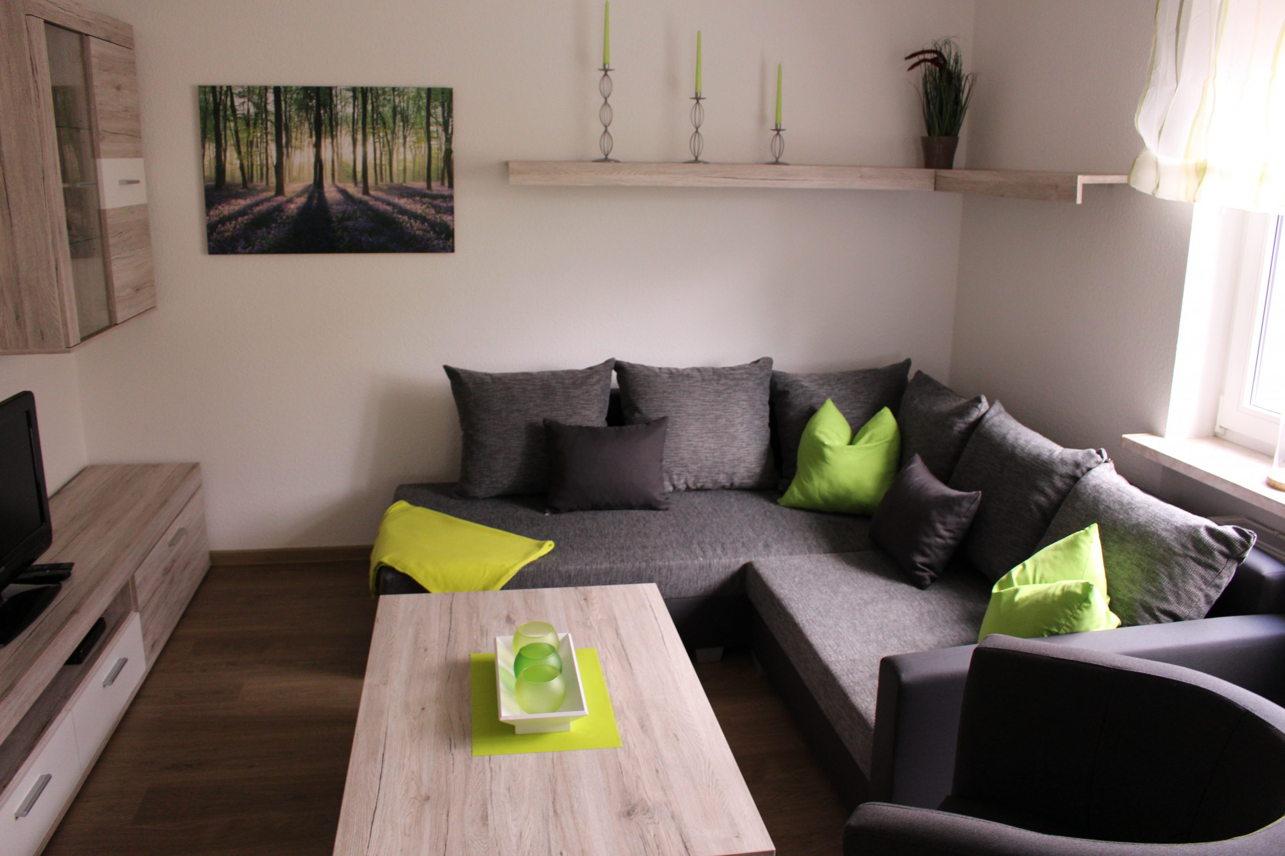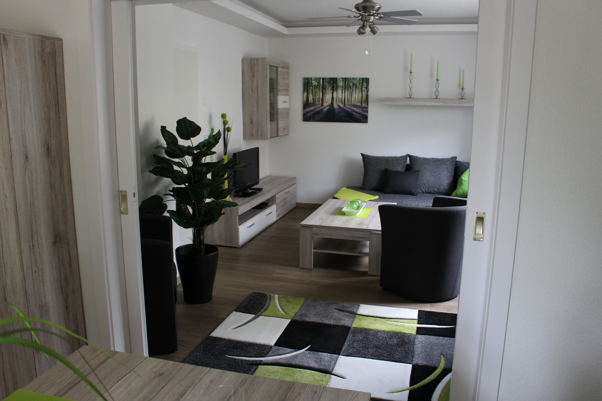 Wohnzimmer, Esszimmer, zwei Schlafzimmer, Küche, Bad, Gäste-WC, Terrasse, Vorgarten
